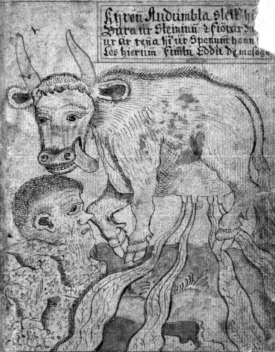 Аудумла лижет ледяные глыбы, способствуя появлению на свет Бури. Изображение в исландском манускрипте XVIII в.