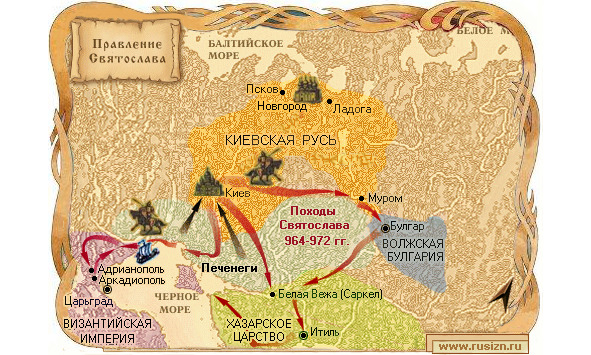 В 965 году Святослав возглавил большой поход на земли Хазарии. Его войска двинулись от Киева мимо Рязани и Мурома, мимо булгарских городов Биляр и Булгар, вниз по Волге до столицы хазарской земли — Итиля. Этот поход окончательно разорил Хазарский каганат, который так и не смог оправиться от набегов русичей. Трехсотлетнее владычество хазар в Центральной Евразии рухнуло.