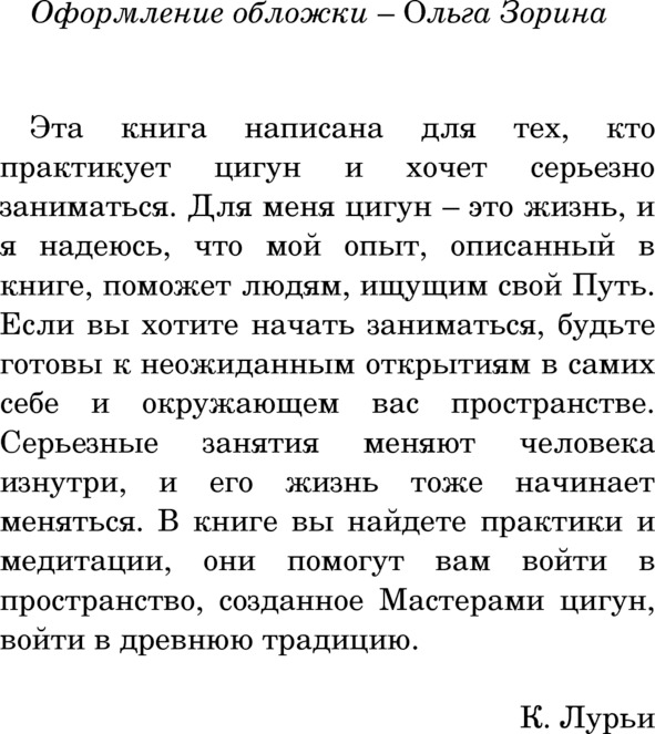 Эта книга написана для тех, кто практикует цигун и хочет серьезно заниматься. Для меня цигун — это жизнь, и я надеюсь, что мой опыт поможет людям, ищущим свой Путь. Если вы хотите начать заниматься, будьте готовы к неожиданным открытиям в самих себе и окружающем вас пространстве. Серьезные занятия меняют человека изнутри, и его жизнь тоже начинает меняться. В книге вы найдете практики и медитации, они помогут вам войти в пространство, созданное Мастерами цигун, войти в древнюю традицию.