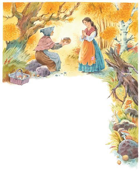 Жила-была бедная богобоязненная девочка; жила она со своею матерью одна, и есть у них стало нечего. Тогда вышла она в лес и повстречалась там со старухою, которая уже заранее знала, в чём её горе. И подарила та старуха ей горшочек, да такой, что ему стоило только сказать: «Горшочек, вари!» – и он начинал варить чудесную, сладкую кашу. А скажешь ему: «Горшочек, по́лно!» – и он тотчас же переставал варить.