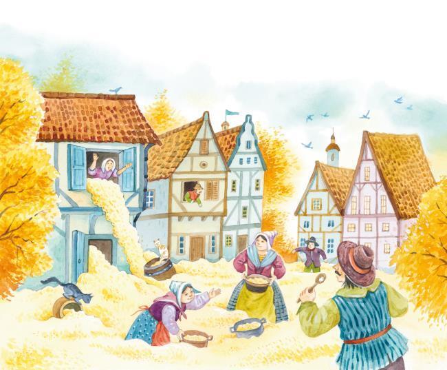 А горшочек-то варит да варит. Каша уж и через край вылезает, а он всё варит. Уж и кухня, и весь домик кашей наполнились, а затем и соседний дом, и вся улица кашей залиты, словно бы горшочек задумал наварить каши на весь белый свет. И беда для всех настала, и никто не мог той беде помочь. Наконец, когда уже изо всей деревни один только домик остался кашей не залит, вернулась девочка домой и только сказала: