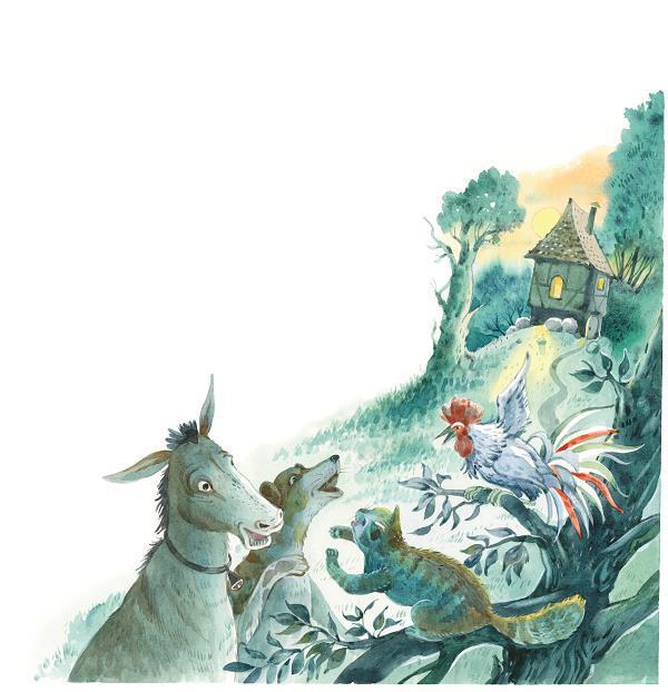 Осёл и собака улеглись под большим деревом, а кот и петух забрались на сук. Петух взлетел на самую макушку дерева, где было ему всего надёжней. Но прежде чем уснуть, он осмотрелся по сторонам, и показалось ему, что вдали огонёк мерцает, и он крикнул своим товарищам, что тут, пожалуй, и дом недалече, потому что виден свет. И сказал осёл: