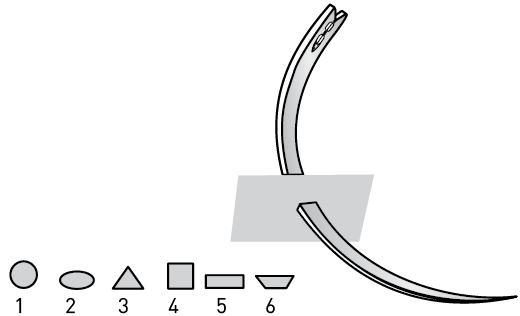 Рис. 8. Особенности формы поперечного сечения тела иглы: 1 — круглое, 2 — овальное, 3 — трехгранное, 4 — квадратное, 5 — прямоугольное, 6 — трапециевидное