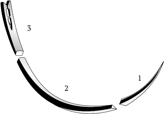 2. Тело: изогнуто на 3/8 или 1/2 длины окружности, поперечное сечение трехгранное, с режущими кромками.