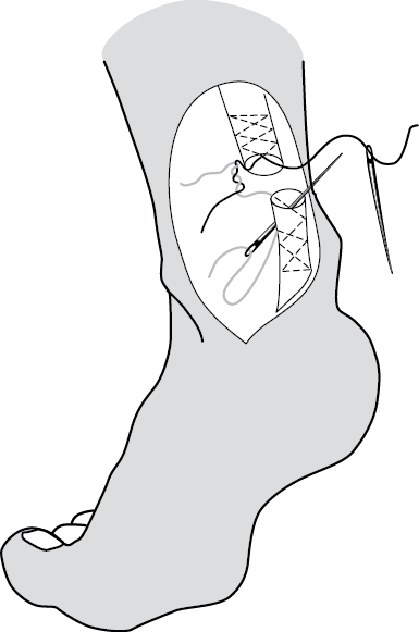 Рис. 2. Наложение швов с помощью прямой иглы на ахиллово (пяточное) сухожилие