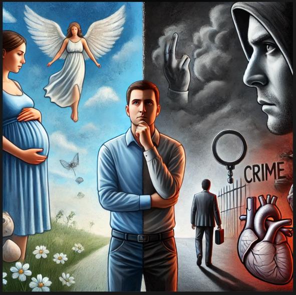 С этической точки зрения тяжкое преступление усложняет выбор. Хотя мужчина также страдает, и его депрессия важна, психологическая помощь беременной женщине становится приоритетной, так как ее состояние — это борьба с неизбежной утратой и конец жизни, где поддержка приобретает особую ценность.