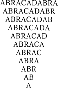 Чтобы защититься от этого демона, от холеры и лихорадки, люди писали имя врага на кусочке пергамента или дощечке. Писали в одиннадцать строчек, всякий раз убирая по одной букве, пока имя не исчезало. Так можно было убить демона, а точнее — дематериализовать его, лишить силы и власти. Затем пергамент или дощечку сжигали или носили в ладанке на груди. Имя демона — это очень важно. Это его программа, которую можно уничтожить. Поэтому у самого сатаны бесконечное множество имён — его человеку не уничтожить, уничтожив имя.