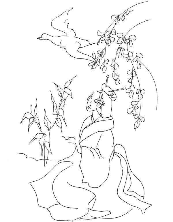 [4] Согласно легенде, в ночь на седьмой день седьмого лунного месяца (конец июля — начало августа по лунному календарю средневековой Японии), единственный раз в году встречаются влюбленные Волопас (Альтаир) и Ткачиха (Вега). Для этого сороки, сцепившись крыльями, образуют мост через Небесную реку (Млечный Путь).