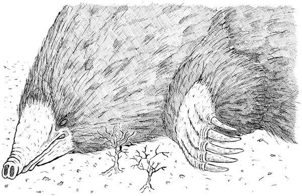 Над землей вырос кротовый холм. Показались сначала усы, потом вся вытянутая черная голова. Она была огромной. Рыло ходило из стороны в сторону, брызгая слюной & пылью. Распахнулась пасть, полная зубов. Тальпа хорошо слышит, и двойной перевод рельсов ее озадачил. Животное зарычало, рассыпая пыль.