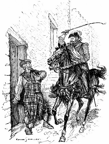 With some suggestion of stealth in his movements, a young man picked his way through the thickening gloom of the streets. There was still light enough to show that, judging by his costume, he was of the well-to-do farmer class. This was proclaimed by his broad, coarse, bonnet and the grey check plaid which he wore, not looped to the shoulder and pinned there by a brooch, Highland fashion, but wrapped round his middle, with the two ends brought over the shoulders and tucked under the wide belt which the plaid itself made, the fringes hanging down at each knee, as a Lowland shepherd might have worn the garment. As he threaded his way through the tortuous streets, ever descending, he heard the clatter of a troop of horse coming up, and paused, looking to the right and left, as if desirous of escaping an encounter which seemed inevitable. But if such were his object, the stoppage, although momentary, was already too long, for ere he could deflect his course, the foremost of the horsemen was upon him, a well known noble of the Scottish Court.