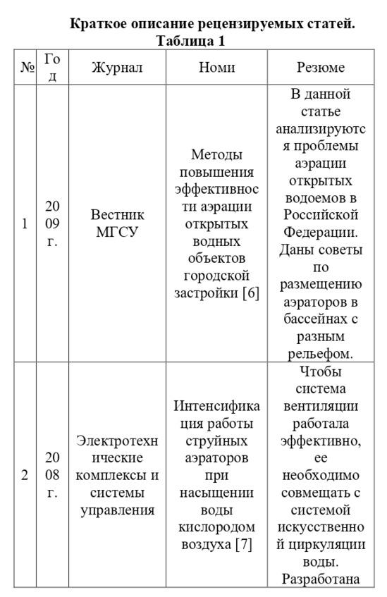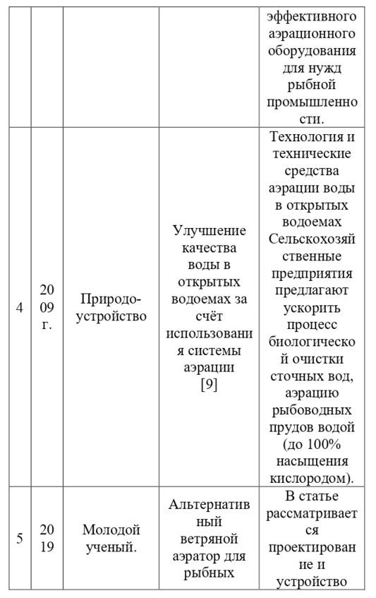 Для полного освещения сути, целей и задач диссертации были проанализированы статьи и диссертации по применению аэраторов в рыбном хозяйстве. Краткое описание рассмотренных случаев приведено в табл. 1.