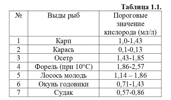 Разные виды рыб имеют различные пороговые концентрации кислорода. В ряде литератур приводятся данные о пороговых значениях кислорода для разных видов рыб (пересчитано из мл/л в более привычные мг/л О2) (Таблица 1.1). Однако при содержании рыбы в прудах нельзя ориентироваться на пороговые значения кислорода, т.к. состояние рыбы при пороговых значениях кислорода — это состояние сильнейшего стресса, предшествующее гибели. Любое уменьшение содержания кислорода, даже до 50% насыщения, может снизить потребление пищи и темп роста молодых рыб даже при наличии прочих благоприятных условий. Существует определенная хорошо выраженная зависимость между активным обменом (т.е. физической активностью) и насыщением воды кислородом. Для осетровых, окуневых и лососевых рыб диапазон кислородных потребностей лежит в пределах от 50 до 90% нормального насыщения. Иными словами, если содержание растворенного в воде кислорода, ниже этого уровня, рыба не может проявлять высокую активность, и в этом случае не будет хорошей рыбной продуктивности. Снижение содержания кислорода ниже 6 мг/л (45% насыщения) в осеннее — зимний период приводит к тому, что форель практически снизит потребление пищи и темп роста.