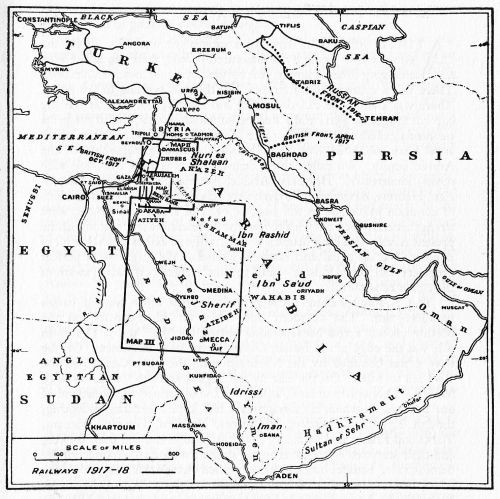 It was a large society, with a sure base in the wild part of Southern Irak, where Sayid Taleb, the young John Wilkes of the Arab movement, held the power in his unprincipled fingers. To it belonged seven out of every ten Mesopotamian-born officers; and their counsel was so well kept that members of it held high command in Turkey to the last. When the crash came, and Allenby rode across Armageddon and Turkey fell, one vice-president of the society was commanding the broken fragments of the Palestine armies on the retreat, and another was directing the Turkish forces across-Jordan in the Amman area. Yet later, after the armistice, great places in the Turkish service were still held by men ready to turn on their masters at a word from their Arab leaders. To most of them the word was never given; for those societies were pro-Arab only, willing to fight for nothing but Arab independence; and they could see no advantage in supporting the Allies rather than the Turks, since they did not believe our assurances that we would leave them free. Indeed, many of them preferred an Arabia united by Turkey in miserable subjection, to an Arabia divided up and slothful under the easier control of several European powers in spheres of influence.
