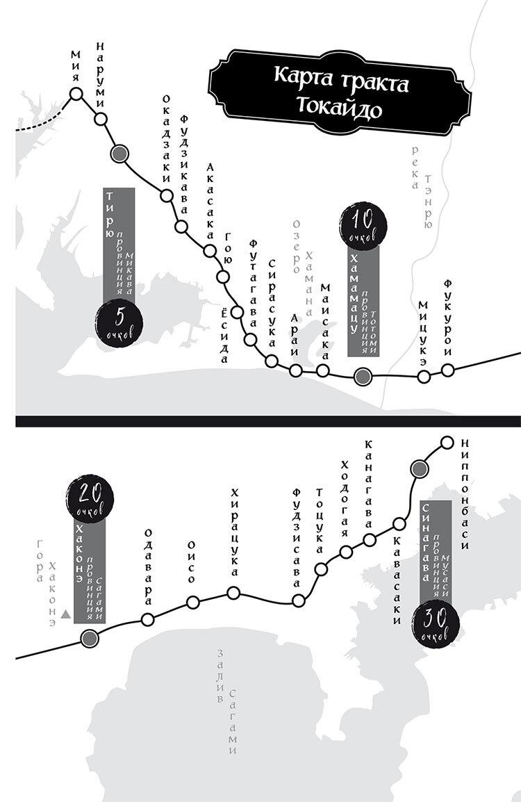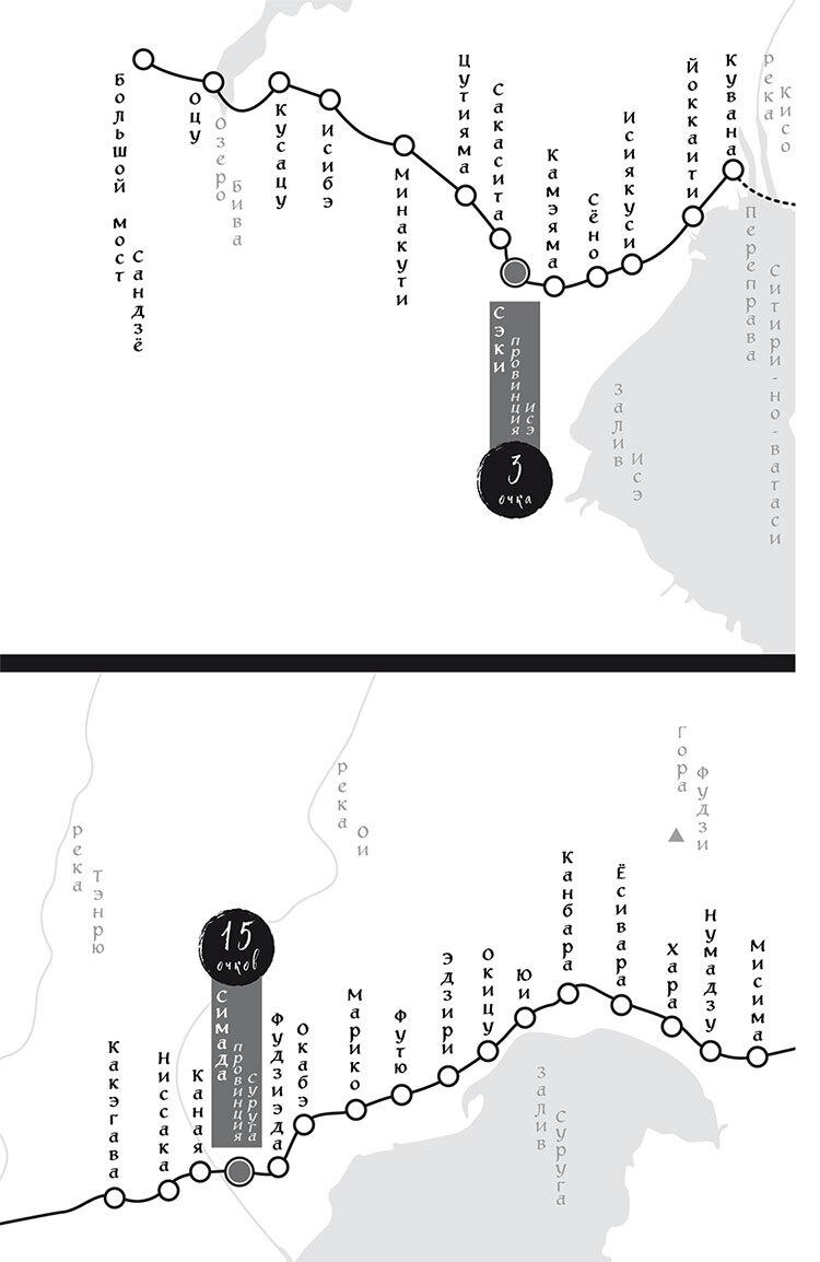 Во-вторых, есть семь точек, через которые необходимо пройти на этом пути. Главные ворота Тэнрю-дзи и шесть мест на дороге Токайдо: застава в Исэ, Тирю в провинции Микава, Хамамацу в провинции Тотоми, Симада в провинции Суруга, Хаконэ в провинции Сагами и Синагава в провинции Мусаси.