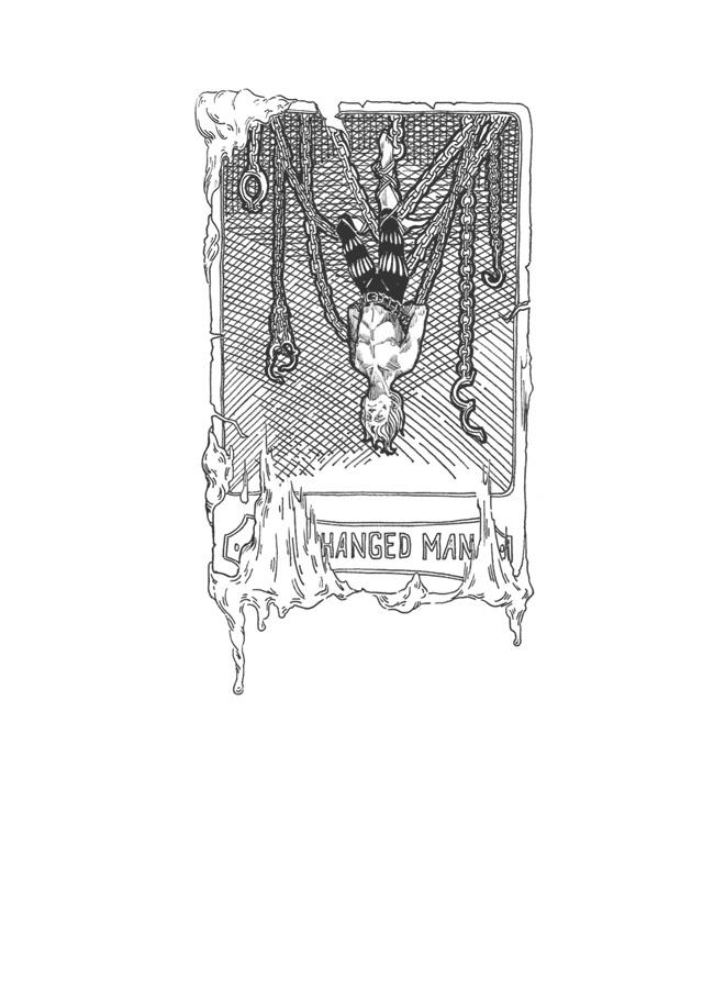 На этой покосившейся стене головой вниз висел вчерашний старик Геннадий Векшин. Подвешенный ржавой цепью за одну ногу, — вторая была согнута в колене, — и мертвый уже несколько часов. Старика удерживала не только цепь, но и проткнувшие его насквозь толстые ледяные клинья, похожие на сосульки. Будто бабочку кто-то пришпилил к стене. Положение заиндевевшего тела вдруг напомнило Черепахину картинку с известной карты Таро. Кажется, она называлась «Висельник».