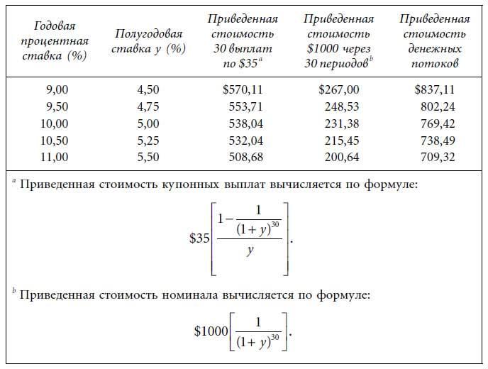 Как следует из материалов главы 2, фундаментальным свойством облигаций без встроенных опционов является изменение цены в направлении, противоположном изменению требуемой доходности облигации. Феномен объясняется тождеством цены значению приведенной стоимости предполагаемых денежных потоков облигации. Рост (падение) требуемой доходности заставляет падать (расти) приведенную стоимость денежных потоков и тем самым уменьшает (увеличивает) цену. В табл. 4.1 приводятся соотношения доходности и цены шести гипотетических облигаций; цена указана для номинальной стоимости, равной $100, и купона, выплачиваемого раз в полгода.