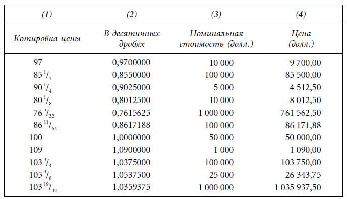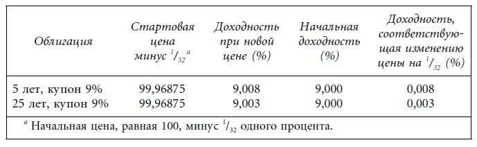 До недавнего времени казначейские ноты и облигации котировались на основе 1/32 процентного пункта. Таким образом, инвесторы рынка казначейских ценных бумаг вычисляли изменение доходности, соответствующее изменению цены на 1/32. Наши две гипотетические облигации с купоном 9% при условии падения цены на 1/32 демонстрируют следующее изменение доходности: