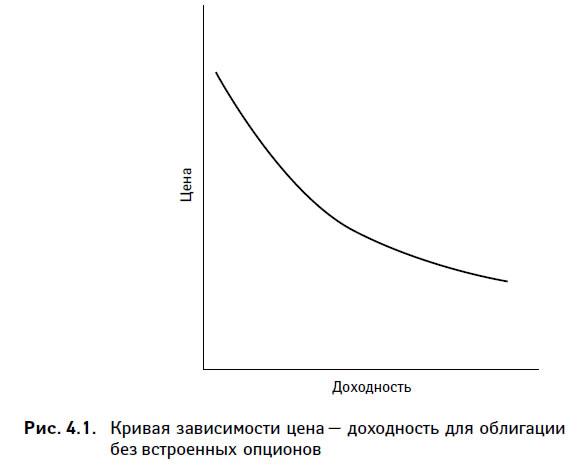 Изобразив зависимость цена — доходность для любой облигации без встроенных опционов графически, мы получим кривую, приведенную на рис. 4.1. Заметим, что при росте требуемой доходности цена облигации без встроенных опционов падает. Это соотношение, однако, не линейно (его график не является прямой линией). Кривую, представляющую зависимость цена — доходность для любой облигации без встроенных опционов, принято называть выпуклой.