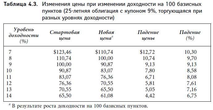 В табл. 4.3 приведены данные о 25-летней облигации с 9%-ным купоном, торгующейся с разными уровнями доходности. В первой колонке показан уровень доходности облигации, во второй — стартовая цена. Третья колонка показывает цену при изменении доходности на 100 базисных пунктов. Четвертая и пятая колонки демонстрируют долларовое и процентное изменение цены. Заметим, что чем выше начальный уровень доходности, тем ниже волатильность цены. Таким образом, при данном изменении доходностей волатильность цен выше на рынке, где уровни доходности низки, и наоборот: при высоких уровнях доходности волатильность невелика.