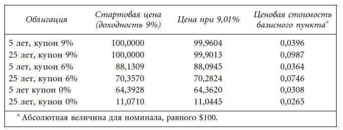 Ценовая стоимость базисного пункта, известная также как долларовая стоимость 01 (dollar value of 01), — это изменение цены облигации при изменении требуемой доходности на один базисный пункт. Обратите внимание на то, что данная мера волатильности описывает долларовую волатильность цены, в отличие от волатильности процентной (изменение цены как процент от стартовой цены). Как правило, ценовая стоимость базисного пункта выражается в виде абсолютной величины изменения цены. Напомним, что, согласно свойству 2 взаимосвязи цена — доходность, волатильность при росте требуемой доходности на 1 базисный пункт равна волатильности при аналогичном падении требуемой доходности.