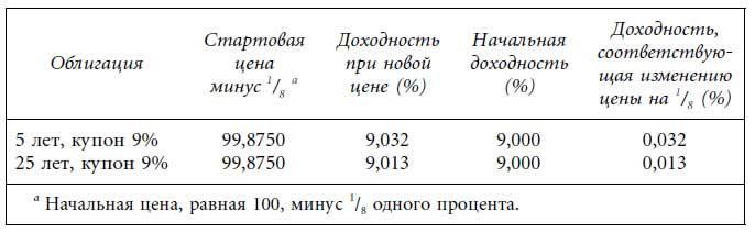 Корпоративные и муниципальные облигации, речь о которых пойдет в главах 6 и 7, торгуются с минимальным изменением цены, равным 1/8 процентного пункта. Таким образом, инвесторы этих рынков вычисляют изменение доходности, соответствующее изменению доходности на 1/8. Две гипотетические облигации с купоном 9% при условии падения цены на 1/8 демонстрируют следующие доходности: