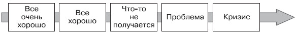 Кстати, проблему нужно распознавать вовремя. «Вовремя» означает до ее «возникновения».Взгляните на рис. 0.3. На нем изображена линия времени. На ней показано состояние дел. Оно проходит стадии «все очень хорошо», «все хорошо», «что-то не получается», «проблема», «кризис». На стадии кризиса что-либо делать, менять может быть уже поздно. Как говорили до введения запрета на ввоз этого товара: «Поздно пить “Боржоми”…» На стадии кризиса для решения проблемы может уже не быть достаточно времени, человеческих, финансовых ресурсов. Или решение обойдется очень высокой ценой. На стадии «проблема» все зависит от срочности, от того, насколько быстро проблема перерастет в кризис. Чем меньше времени, тем дороже будет стоить преодоление проблемы и тем меньше шансов, что решение окажется действительно оптимальным.Чаще всего решение проблемы напоминает «сбивание температуры» вместо лечения болезни. Хорошо, если проблему стали решать, когда ее еще нет, просто что-то не так или что-то не получается. В таком случае есть достаточно времени, чтобы подумать, найти оптимальное решение, достаточно ресурсов, и, как только проблема появится, она действительно будет решена недорого и оптимальным способом.