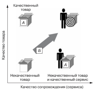 13. Перенасыщение рынка дешевой продукцией «терпимого» качества.На рынке дешевой продукции свирепствует жесткая ценовая конкуренция, которая привела к значительному снижению рентабельности. При этом есть масса возможностей для продажи более дорогого, отличающегося товара или продажи с помощью предоставляемого сервиса. Ситуация сегодня напоминает ситуацию, показанную на рис. 0.1. Сегодня уже редки случаи предложения рынку некачественного товара. Точки А показывают наиболее распространенную практику. Стрелка Б – общую тенденцию развития рынка. А пока еще открытые возможности для компаний, желающих быть конкурентоспособными и завоевывать рынок, показаны в виде цели (мишени).