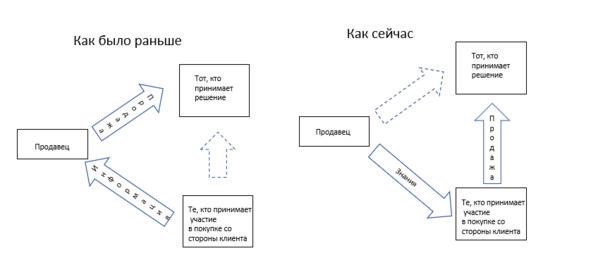 Почему? Просто выстраивания только межличностных отношений уже недостаточно. Если раньше все книги о продажах говорили, что надо стараться выстраивать отношения чуть ли не с первой встречи, обращать внимание на фотографии на стенах офиса, льстить клиенту, то сейчас такая коммуникация выходит на второй план.