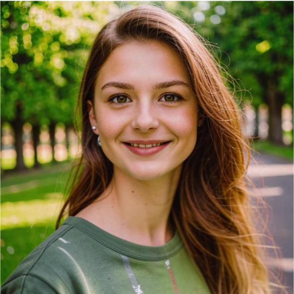 Её карие глаза могут меняться в зависимости от освещения, становясь светло-золотистыми или почти чёрными. Ресницы длинные и пушистые. Носик прямой и не слишком крупный. Губы мягкие, ещё по-детски пухлые, но с уже чётким контуром.