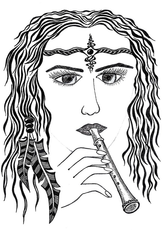 Внутреннее убранство лачуги не отличалось от мрачности её внешнего вида. На закопчённых бревенчатых стенах, под низким потолком висели связками колдовские травы и какие-то засушенные зверьки, поэтому воздух был пропитан смесью самых разных запахов, от коричных и хвойных, до густых и сладковатых мясных. В дальнем углу комнаты был очаг, над которым висел большой котёл. Казалось, что огня нет, но в чёрной посудине что-то тихонько булькало. Скорей всего с помощью колдовских чар готовилось какое-то зелье. На низеньком деревянном столике стояла большая сальная свеча и тихонько потрескивала. Рядом лежали перевязанные красными нитками берестяные свитки с прожжёнными насквозь значками. На одной из стен висели три бубна. Большой бубен был обтянут белой кожей и имел красный орнамент. Второй, чуть меньше – был серым и обвешанным перьями. Рядом с ними чернел третий бубен, самый маленький. На деревянной полке стояли стопкой разные плошки из глины и дерева, а также всевозможные банки с порошками.
