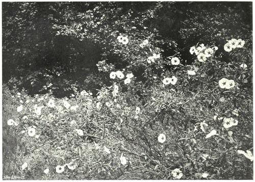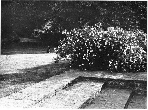 One of the joys of June is the beauty of the Scotch Briers. On the south side of the house there are Figs and Vines, Rosemary and China Roses; a path and then some easy stone steps leading up to the strip of lawn some fifty feet wide that skirts the wood. To right and left of the steps, for a length equal to that of the house-front, is a hedge of these charming little Roses. They are mostly double white, but some are rosy and some yellow. When it is not in flower the mass of small foliage is pleasant to see, and even in winter leaflessness the tangle of close-locked branches has an appearance of warm brown comfort that makes it good to have near a house.