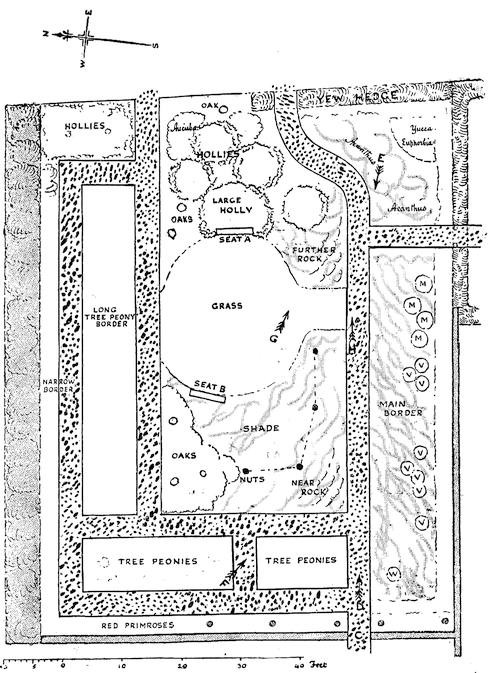 My spring garden lies at the end and back of a high wall that shelters the big summer flower border from the north and north-west winds. The line of the wall is continued as a Yew hedge that in time will rise to nearly the same height, about eleven feet. At the far end the Yew hedge returns to the left so as to fence in the spring flowers from the east and to hide some sheds. The space also encloses some beds of Tree Peonies and a plot of grass, roughly circular in shape, about eight yards across, which is nearly surrounded by Oaks, Hollies and Cobnuts. The plan shows its disposition. It is of no design; the space was accepted with its own conditions, arranged in the simplest way as to paths, and treated very carefully for colour. It really makes as pretty a picture of spring flowers as one could wish to see.