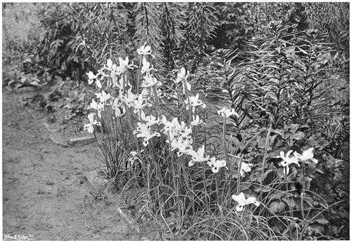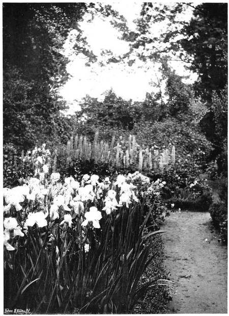 The foot of the near mound is a pink cloud of London Pride. Shooting up among it and just beyond is the white St. Bruno's Lily. More of this lovely little lily-like Anthericum is again a few feet further along, grouped with Iris Cengialti, one of the bluest of the Irises. The back of the mound has some of the tenderly tinted Caparne hybrid Irises two feet high, of pale lilac colouring, rising from among dark-leaved, white-bloomed Iberis, and next the path a pretty, large-flowered tufted Pansy that nearly matches the Iris.