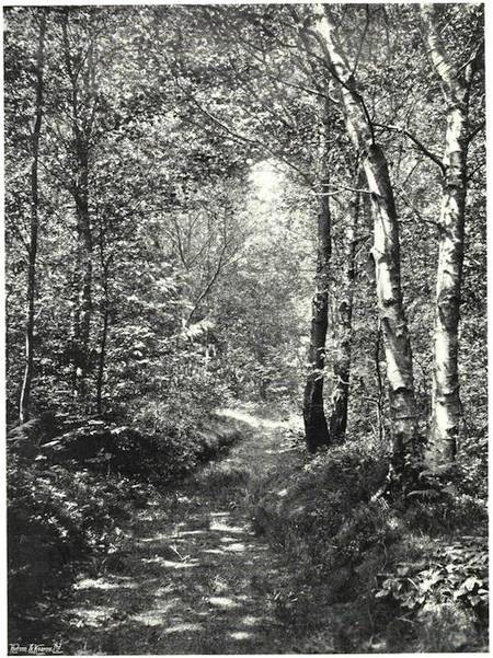 Now the path crosses another of the broad turfy ways, but here the turf is all of Heath; a fourteen-foot wide road of grey-rosy bloom in August; and now we are in the topmost region of Scotch Fir, with undergrowth of Whortleberry.