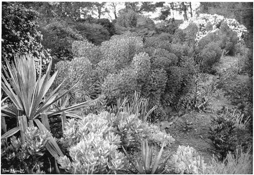 One of my desires that can never be fulfilled is to have a rocky hillside in full sun, so steep as to be almost precipitous, with walls of bare rock only broken by ledges that can be planted. I would have great groups of Yucca standing up against the sky and others in the rock-face, and some bushes of this great Euphorbia and only a few other plants, all of rather large grey effect; Phlomis, Lavender, Rosemary and Cistus, with Othonna hanging down in long sheets over the bare face of the warm rock. It would be a rock-garden on an immense scale, planted as Nature plants, with not many different things at a time. The restriction to a few kinds of plants would give the impression of spontaneous growth; of that large, free, natural effect that is so rarely achieved in artificial planting. Besides natural hillsides, there must be old quarries within or near the pleasure-grounds of many places in our islands where such a scheme of planting could worthily be carried out.