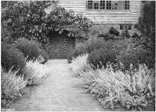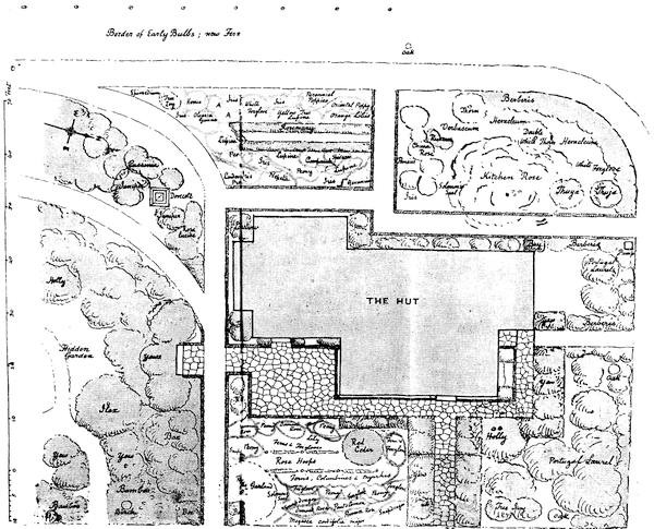 The border next the paving has clumps of the old garden Peonies (P. officinalis). By the time these are over, towards the end of June, groups of the earlier orange Herring Lilies are in bloom. A thick and rather high Box edging neatly trims these borders, and favours the cottage-garden sentiment that is fostered in this region. At the back of the Yews that form the arbour is one end of the Hidden Garden. Going along the path, past the projection on the block-plan of the Hut, which represents the large ingle of the studio, we come to the other bit of June garden behind the little cottage. Here again, the space being over-wide, it is divided in the middle by a double border of Rosemary that is kept clipped and is not allowed to rise high enough to prevent access to the border on each side.