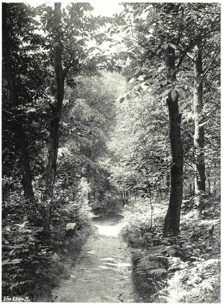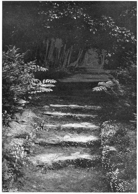 The path leaves the garden again by a repetition of the rough stone steps. The mossy growth of Arenaria balearica clings closely to the stones on their cooler faces, and the frond-like growths of Solomon's Seal hang out on either side as a fitting prelude to the dim mysteries of the wide green wood-path beyond.