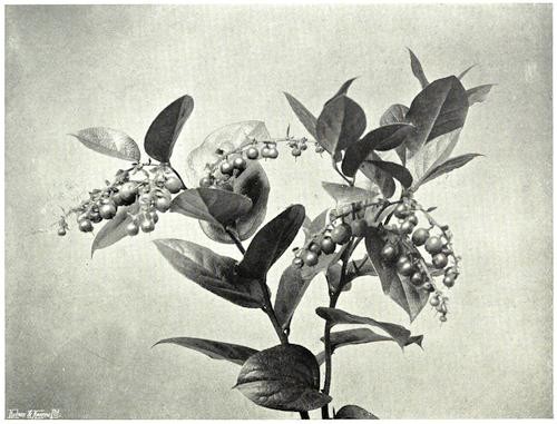 The path has been steadily rising, and now the ascent is a little steeper. The character of the trees is changing; Oaks are giving way to Scotch Firs. Just where this change begins the bank to right and left is covered with the fresh, strong greenery of Gaultheria Shallon. About twenty years ago a few small pieces were planted. Now it is a mass of close green growth two to three feet high and thirty paces long, and extending for several yards into the wood to right and left. In a light, peaty soil such as this, it is the best of undershrubs. It is in full leaf-beauty in the dead of winter, while in early summer it bears clusters of good flowers of the Arbutus type. These are followed by handsome dark berries nearly as large as black currants, covered with a blue-grey bloom.