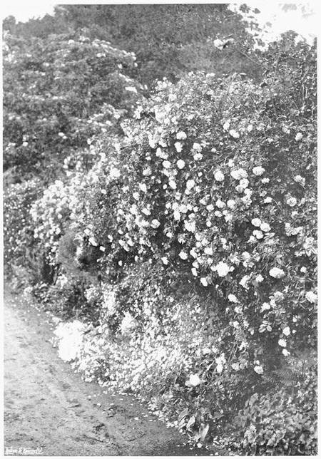 On the left-hand side, behind the sunny bank, a Garland Rose comes through and tumbles out of a Yew, and some sprays of an old bush of the single R. polyantha, that has spread to a circumference of one hundred and fifty feet, have pushed their way through the Ilex.