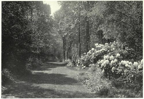 The wood path next to this goes nearly straight up through the middle of the ground. It begins at another point of the small lawn next the house, and passes first by a turf walk through a mounded region of small shrubs and carefully placed pieces of the local sandstone. Andromeda, Skimmia, and Alpenrose have grown into solid masses, so that the rocky ridges peer out only here and there. And when my friends say, "But then, what a chance you had with that shelf of rock coming naturally out of the ground," I feel the glowing warmth of an inward smile and think that perhaps the stones have not been so badly placed.