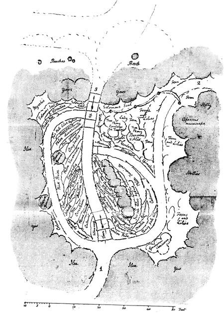 When the Spring flowers are done, and before the full June days come with the great Flag Irises and the perennial Lupines, there is a kind of mid-season. If it can be given a space of ground it will be well bestowed. I have a place that I call the Hidden Garden, because it is in a corner that might so easily be overlooked if one did not know where to find it. No important path leads into it, though two pass within ten yards of it on either side. It is in a sort of clearing among Ilex and Holly, and the three small ways into it are devious and scarcely noticeable from the outside. The most important of these, marked 1 on the plan, passes between some clumps of overarching Bamboo and through a short curved tunnel of Yew and Ilex. Another, marked 2, is only just traceable among Berberis under a large Birch, and comes sharply round a tall Monterey Cypress. The third turns out of one of the shady woodland glades and comes into the little garden by some rough stone steps.