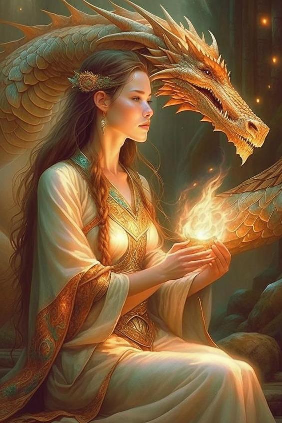В землях, где сотканы нити магии и сказок, где рождаются чудеса и воплощаются мечты, пребывала женщина, олицетворение высшей силы тепла и созидания. Ее имя звучало как мелодия ветра, словно шепот тайных заклинаний — Алария, драконица из далеких земель.