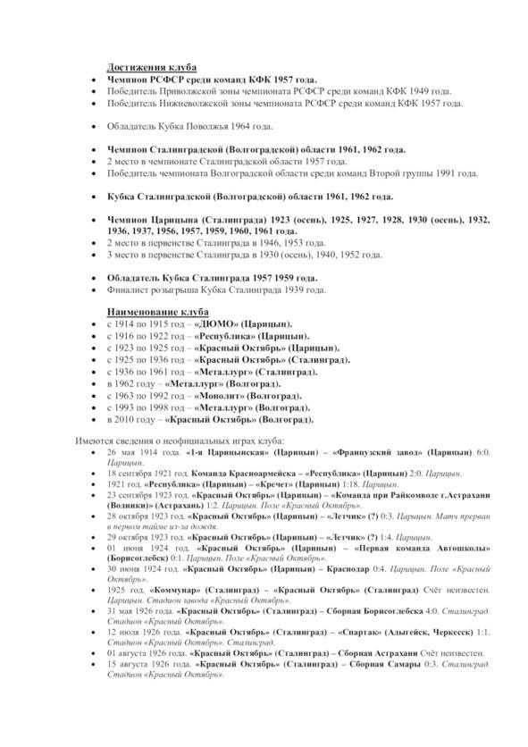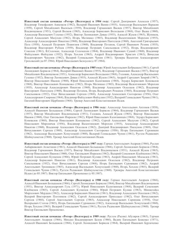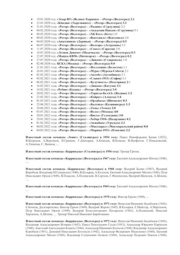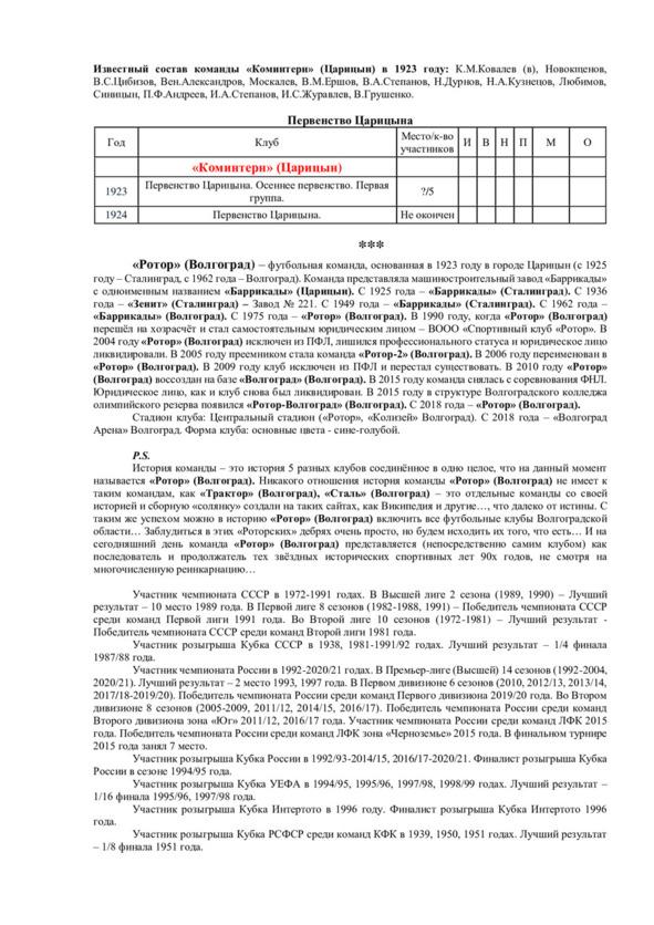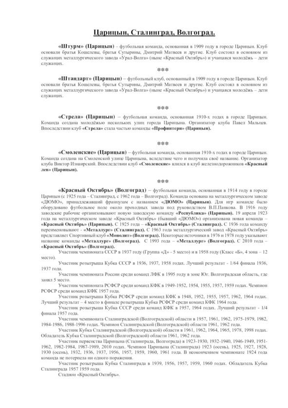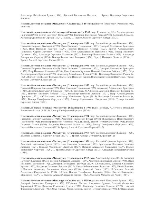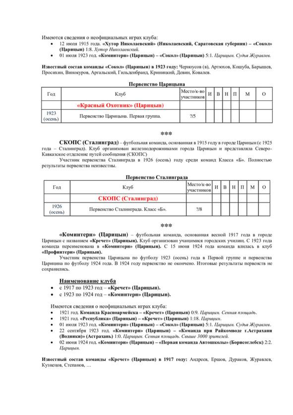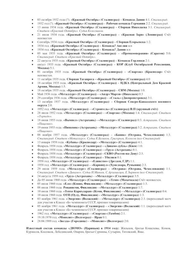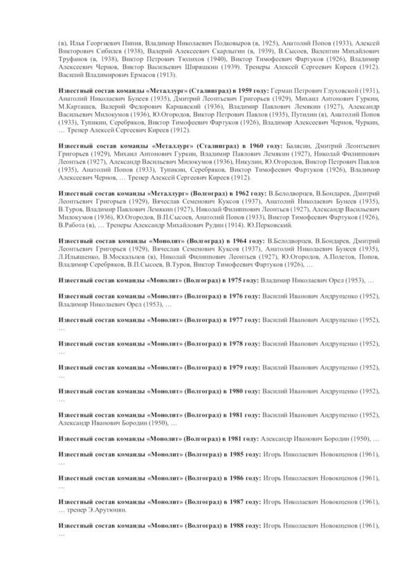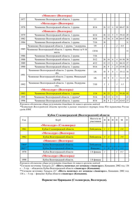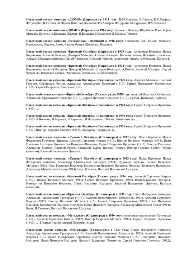Данное издание появилось на свет только благодаря общей работе (авторов изданий и всех, кто помогал в сборе материала) по сохранению истории футбола Волгоградской области таких профессионалов в своём деле как В.Д.Андреев, Ю.А.Кошель, Р.Д.Савелов, А.Ф.Толтопятов, П.В.Полуничев, В.Н.Федоров, В.П.Тотфалушин, А.А.Бояренко, В.Н.Конончук, Н.И.Травкин, И.С.Добронравов, Г.И.Вертегел, В. Бурляев, С. Андрюков, С.М.Воробьёв, С.С.Кирилловых, А. Маркишов, В.А.Глубоков, Г. Сааков, В. Силантьев, В. Слобожанин, Г.Н.Калянов, Э.М.Нисенбойм, В. Олейник, А. Павлов, А.А.Скляренко, И.Ю.Гайдашев, В.П.Вишталь, М.Л.Рубан, В.А.Яровой, С.В.Тимченко, Ф.Н.Шмалько, Д. Москаленко, В. Колос, В. Шкробышев, Н. Казанцев, А. Самосват, А Филоненко, Ан. Филоненко, С. Малышев, В. Беликов, В. Владимиров, А. Синев, С. Шитиков, Г.Н.Кассиди, В.Н.Кудактин, Г.Е.Чекунов, Д.Г.Татаров, С. Сазонова, В.М.Кадашова, И.Н.Морина, А.А.Егоров, С. Бобылев; организаторов и основных ведущих футбольных интернет-сайтов: https://footballfacts.ru/ (Footballfacts. Футбольная статистика и не только), http://regional-football.ru/ (Региональный футбол России), http://www.rsssf.com/ (Фонд статистики спортивного футбола), http://lena-dvorkina.narod.ru/FOOTBALL_2013/FC_Russia/ArkhObl4.htm (История футбольных клубов), https://www.footbook.ru/ (Сайт футбольной статистики), http://wildstat.ru/ (Футбольные результаты и статистика); https://kwadra.ru/ (Футбол в протоколах); https://fc-dynamo.ru/cup/ (Все матчи Кубка СССР и России); https://vk.com/club174604624 (Нелиговый и юношеский футбол СССР); https://www.flashscore.com/ (flashscore.com).