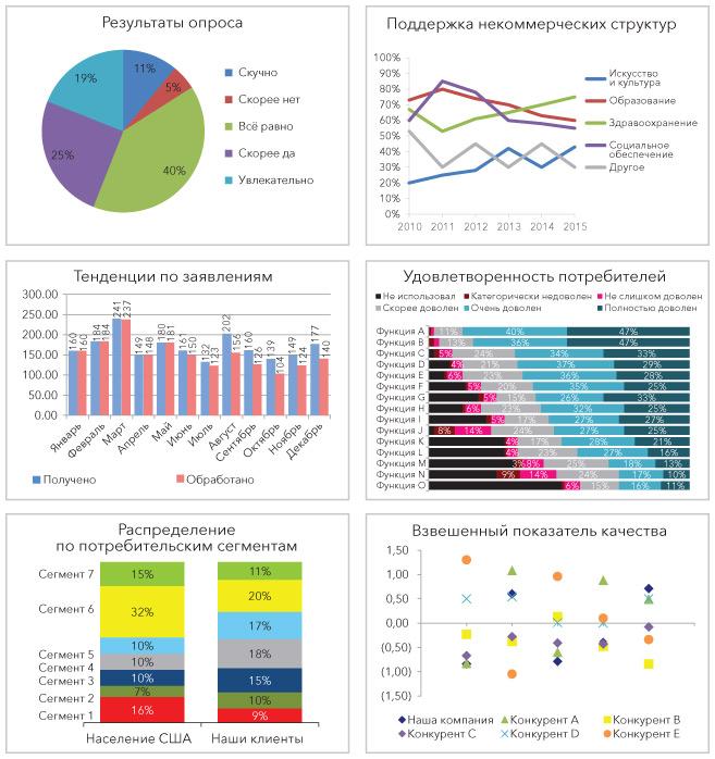 Подробный анализ образцов очень полезен. В этой главе мы рассмотрим пять примеров и обсудим особенности мыслительного процесса и дизайнерских решений, которые привели к созданию этих схем. При этом мы будем опираться на уже знакомые уроки. Мы проанализируем, почему был выбран определенный тип визуального представления данных; оценим, что и как можно выделить или оставить без внимания с помощью цвета, толщины линий и соотношения размеров. Мы обсудим выравнивание и расположение компонентов, а также эффективность формулировок в названии и описании диаграмм и графиков и в подписях.