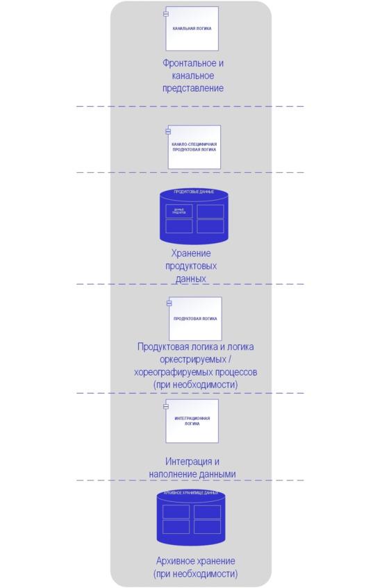• Зачастую в каждом продукте присутствуют элементы логики, зависящие от канала коммуникации с клиентом или партнером. Например, логика расчета процентов по кредиту может определяться в том числе видом канала заказа продукта (интернет-клиент, мобильный клиент, отделение и т. д.). Такую логику мы именуем канало-специфичной и также включаем в концептуальную архитектуру продукта. Отметим, что принципиально данный архитектурный слой продуктовой логики не является обязательным: продукт может не иметь зависимости от конкретного канала, например, условия кредита могут не зависеть от канала оформления кредитного продукта. Также он может быть совмещен с общей продуктовой логикой — канальные условия могут учитываться в продуктовых бизнес-процессах. Но мы настаиваем на его выделении, поскольку в данном случае мы получаем возможность изменять логику, зависящую от канала, независимо от общей продуктовой логики и тем самым сокращать потенциальные объемы регрессионного тестирования при развитии продукта. Кроме того, данный подход позволяет бесшовно изменять количество каналов обслуживания, в которых доступен продукт, что принципиально важно в условиях повсеместного распространения дистанционных каналов.