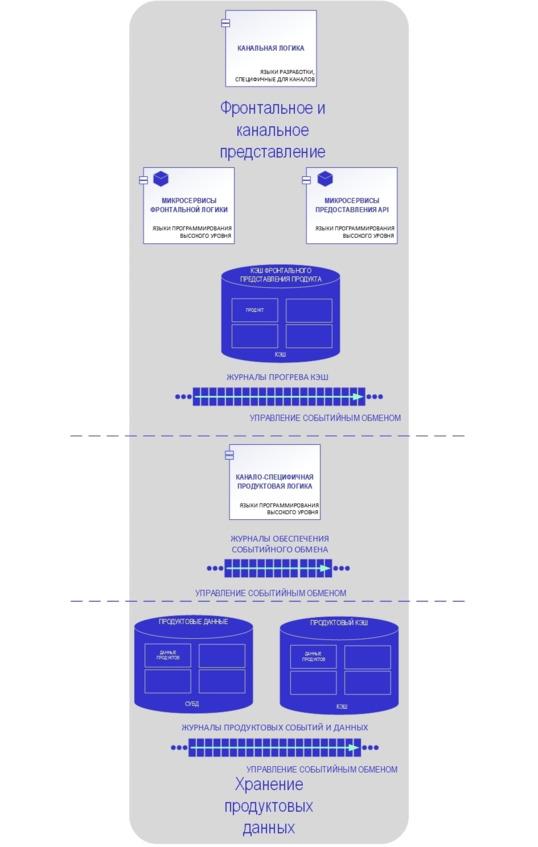 Как правило, обеспечение быстрого доступа к данным, обрабатываемым на уровне фронтального представления продукта, осуществляется с использованием механизма кэширования информации, например в оперативной памяти. Именно с этой целью на Рисунке 3 размещен компонент кэширования, содержащий данные фронтального представления. Одновременно с этим необходимо обеспечивать наполнение кэш актуальными данными / переносить новые данные из кэширующих компонентов в долговременные хранилища на смежных уровнях автоматизации. Для решения подобной задачи нередко используются технологии поддержки событийного обмена с целью обеспечения минимальной взаимозависимости между компонентами, составляющими продукт. На Рисунке 3 рассматриваемая задача решается журналами «прогрева» кэш, реализуемыми с использованием событийных механизмов.