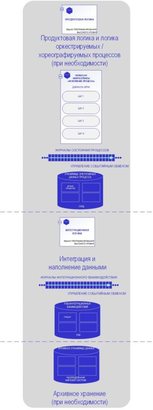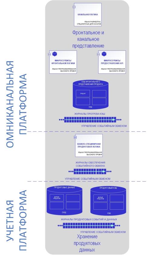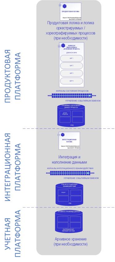 Таким образом, для поддержки автоматизации канальной и канало-специфичной логики применяется омниканальная платформа, для поддержки автоматизации продуктовой логики, управления оркестровкой и хореографией — продуктовая, оперативного и архивного хранения продуктовых данных — учетная, наполнения внешними данными — интеграционная.
