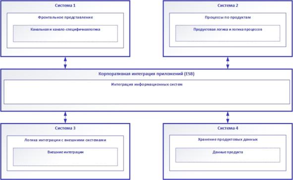 Для наглядности предположим, что автоматизация продукта осуществляется при помощи четырех автоматизированных систем (возможно, каждая из них реализована в микросервисной парадигме), при этом интеграция между ними осуществляется посредством корпоративной сервисной шины (ESB), в соответствии с практиками SOA. В этом случае каждая информационная система специализируется на своих функциях, продукт же является результатом их скоординированного исполнения: