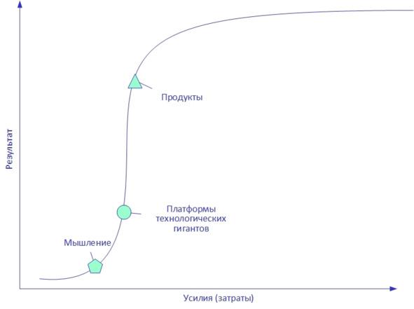 Условность приведенного сравнения определяется тем фактом, что мы сводим на один рисунок, казалось бы, принципиально разные явления: изменение мышления, применение платформенного и продуктового подхода, между которыми лишь несколькими строками выше проводили водораздел. На самом деле никакого противоречия нет: именно применение платформенных подходов позволяет кардинально повысить эффективность перехода к продуктовому мышлению, которое в свою очередь обеспечивает качественное создание и развитие продуктов организации, меняющей мышление и внедряющей платформы. Таким образом, мы наблюдаем спиралеобразный характер развития организации и рынка в целом, включающий мышление, платформы и продукты. Внимательный читатель незамедлительно поинтересуется тем фактом, почему же продукты находятся на S-кривой выше платформ (тем более, платформ технологических гигантов), а платформы выше мышления. Нет ли тут ошибки с нашей стороны? Мы же ответим, что никакой ошибки нет, и вот почему.