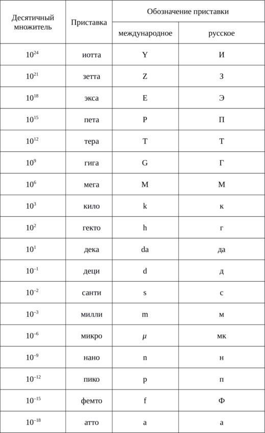 Множители и приставки, используемые для образования наименований и обозначений десятичных кратных и дольных единиц